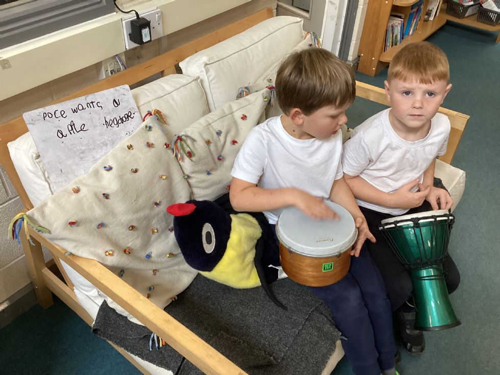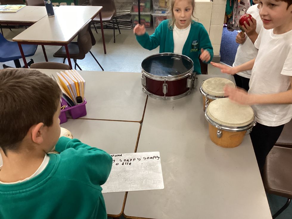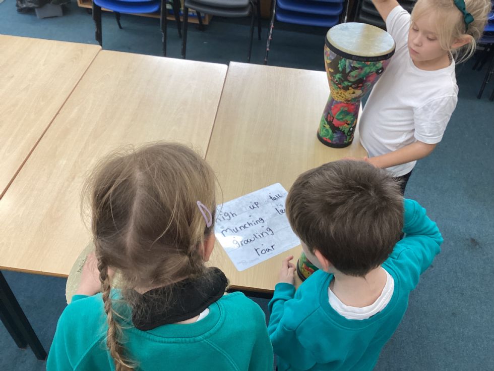 In music, the children worked in groups to create their own call and response rhythms. They practised them with claps first, then moved onto using percussion instruments.