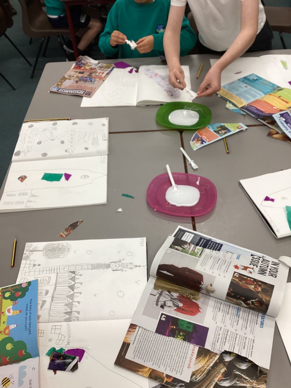 In art, we explored collaging and had a go at cutting and ripping different paper type materials to create a collage of Big Ben. The children loved finding the right bit of paper they wanted for the collage and creating different textures with the paper. We also used water colours to create a sky background, ready to collage a London Skyline onto them next week!