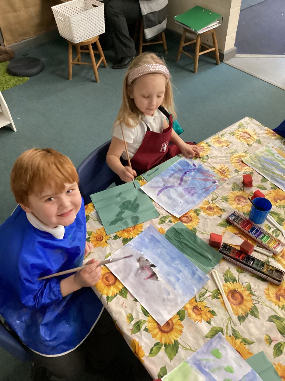We had lots of fun experimenting with different painting techniques. The children moved around tables to try out painting different ways, such as using sponges to dab, scraping with spatulas and dotting with paintbrushes. They had lots of fun experimenting in preparation for their seascape inspired by Monet. Each child used different painting techniques to create their own unique painting. They all looked fabulous!
