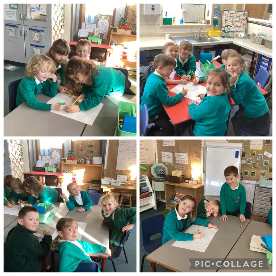 In English, we explored the book Once Upon a Raindrop. The children thought carefully about what the story was about and shared why they liked it. They wrote about their favourite part of the book, explaining their reasons clearly. We also learnt about rhyming words, identifying where the rhymes appear in the story. The children then worked in groups to think of their own rhyming words linked to different types of weather, before writing these independently in their books.